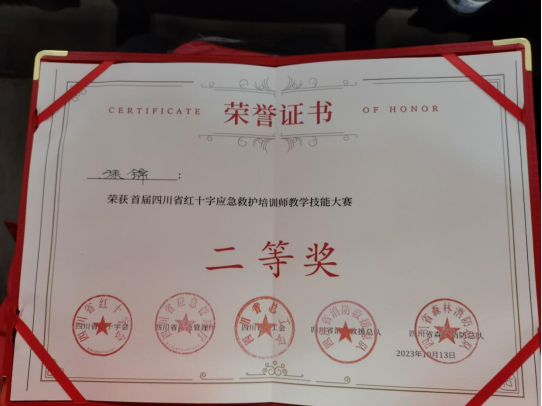 我校临床医技学院教师徐锦,作为自贡市应急救护优秀师资,代表自贡红十字会亮相赛场。通过急救护理论教学(说课)和实操教学两个环节的激烈角逐,获得二等奖,并在颁奖仪式中,受邀上台再次进行说课风采展示,系全场唯一。