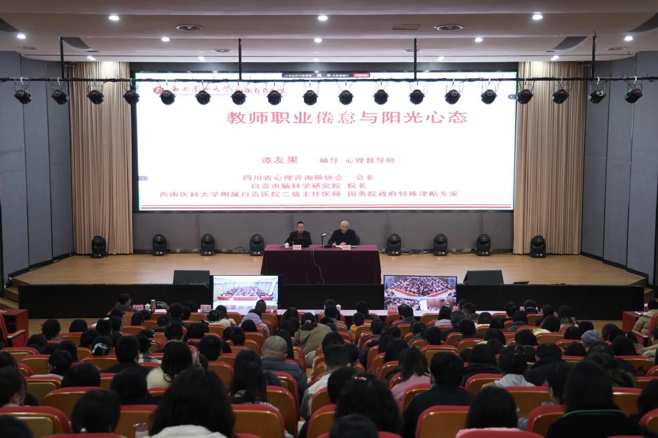 为进一步加强教职工心理健康建设,筑牢教育教学工作精神根基,12月3日,学校特邀自贡市人大科教文卫委员会副主任谭友果以“教师职业倦怠与阳光心态”为主题为全校教职工开展心理健康教育宣讲。