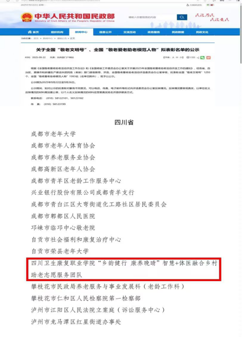 10月29日,全国老龄工作委员会办公室正式公布全国“敬老文明号”和全国“敬老爱老助老模范人物”表彰名单,我校护理学院“乡韵健行 康养晚晴”智慧+体医融合乡村助老志愿服务团队凭借扎实的服务成效、创新的志愿服务模式,被授予全国“敬老文明号”称号。