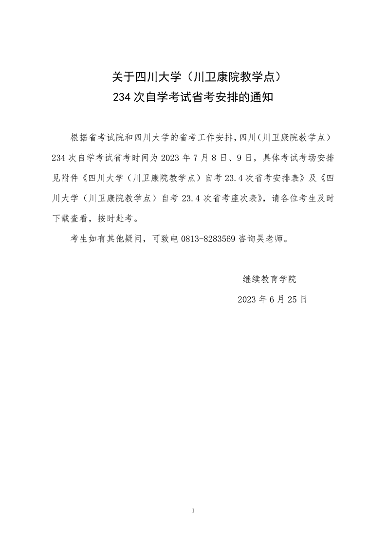 关于四川大学(川卫康院教学点)234次自学考试省考安排的通知