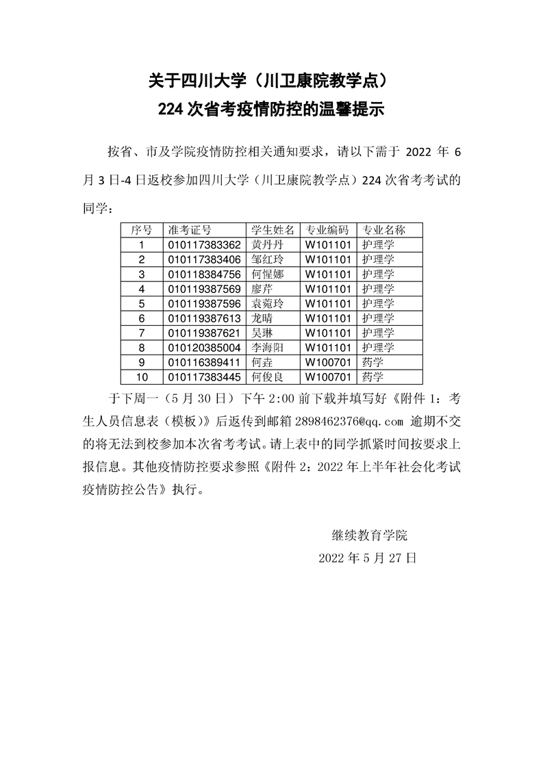 关于四川大学(川卫康院教学点)224次省考疫情防控的温馨提示