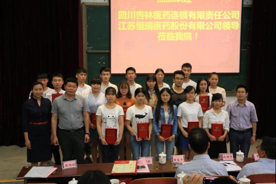 最后,江苏恒瑞医药股份有限公司四川区经理赵明宇、四川杏林医药连锁有限责任公司人力行政部总监张伟分别代表两家公司致辞。张伟表示在校企合作培养中,学员的潜力可被充分地挖掘和发挥,并期待校企双方进一步更加深入和广泛的合作。赵明宇则希望学员们,除了学习好专业知识,还须做到以下三点:一是做好从头学、不断学的准备;二是要长期坚持,克服困难,不断前进;三是要真诚待人,善待自己,多忠厚老实,少斤斤计较。