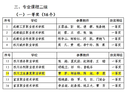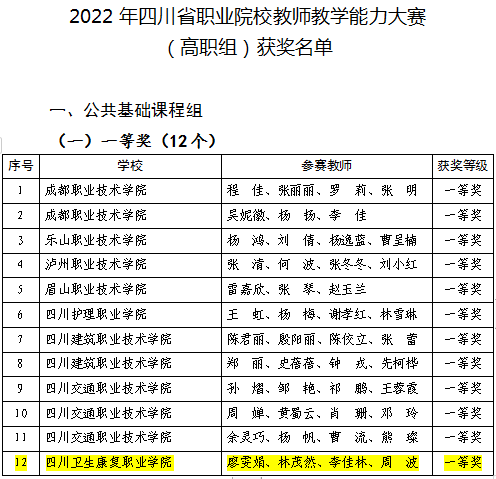 在2022年四川省职业院校教师教学能力大赛中,我校参赛的8支队伍全部获奖。其中高职组康复治疗专业群内公共基础课教师获“公共基础课程组”三项大奖:周波、李佳林、林茂然、廖文娟获一等奖,蒋晓娟、张茂、段晓芳、张莉获三等奖,洪晓静、杨怡、梁乔、李捷获三等奖;群内专业基础课教师陈帅、陈荣、何福超获“专业课程一组”三等奖;群内护理专业教师邹金梅、曹梦、李霞、陈旭获“专业课程二组”一等奖,群内康复治疗技术专业教师任凯、牟杨、袁燕琳、赵江获“专业课程二组”二等奖;群内护理专业教师王敏获中职组“专业技能课程二组”三等奖;药品食品学院教师郑茜、杨洋、梁菊俄获“专业课程一组”三等奖。这是学校在四川省教师教学能力比赛中首次突破一等奖奖项,学校获评“最佳进步奖(高职组)”奖项。