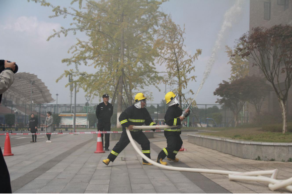 消防应急演练模拟了学院创业中心一楼着火失控、人员被困和扑救处置场景。