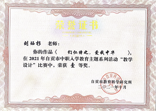 近日,由自贡市教育科学研究所举办的2021年自贡市中职入学教育主题系列活动比赛落下帷幕,学院护理学院辅导员刘珏杉代表学校参加比赛教学设计赛项,其作品《们仁特之,爱我中华》从全市13所职业学校28个参赛作品中脱颖而出,喜获一等奖,并由市教育体育局推荐参加全省比赛。