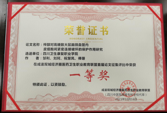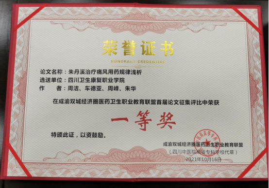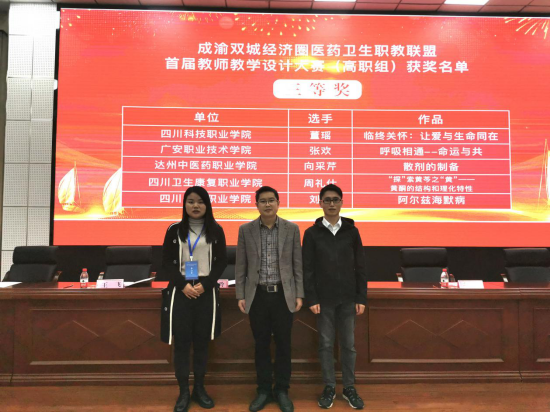 在近日刚刚结束的成渝双城经济圈医药卫生职教联盟、四川省中医药职业教育协会年会上,我校药品食品学院教师参赛作品从众多作品中脱颖而出,荣获论文征集评比一等奖2项(邹利、周洁)、二等奖1项(周礼仕),中医药创新创业大赛三等奖1项(邹利等指导),教学设计大赛三等奖1项(周礼仕)。