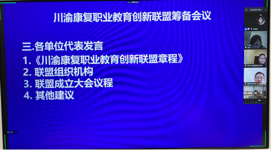 为推动川渝地区双城经济圈康复人才职业教育改革,促进康复教育事业发展,提升服务川渝地区康复产业的能力,由四川卫生康复职业学院、成都铁路卫生学校、重庆科创职业学院发起成立“川渝康复职业教育创新联盟”(以下简称“联盟”)。12月12日,联盟筹备视频会议顺利召开。本次会议由学院副院长章荣主持,川渝地区康复职业教育相关院校、医疗单位、行业企业共计17家单位参加。