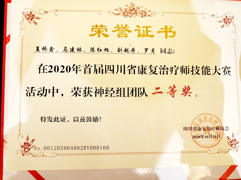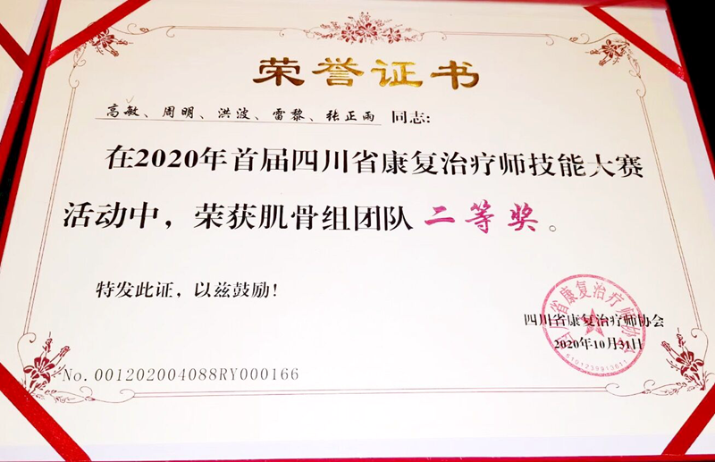 11月1日,在四川省康复治疗师协会举办的“2020年首届四川省康复治疗师技能大赛”中,康复系教师罗亚玲领队的康复治疗师团队获得神经组团队二等奖,刘安忠领队的康复治疗师团队获得肌骨组团队二等奖。同时团队成员高敏获得康复评定第二名、周明获得康复宣教第二名、董贞获得青年论文三等奖。