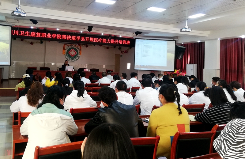 在道孚县人民医院学术厅,52名临床医生、护士参加了学院对道孚县开展的医疗帮扶培训班。江从兵结合道孚医疗现状,以“高原地区接诊抢救危急重症患者”为题展开专题培训,并结合道孚县在今年新冠肺炎疫情中的具体情况做了关于“提升基层卫生组织应对突发公共卫生事件能力”的专题讲座。