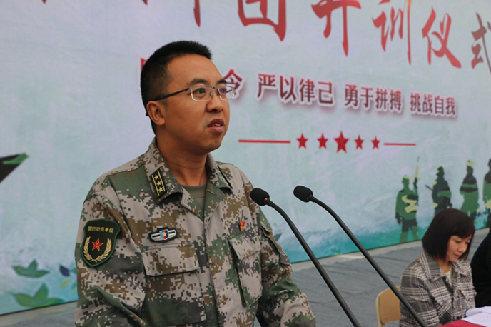 滕建军代表沿滩区人民武装部和承训全体教官向参加军训的未来医务工作者们表示敬意,强调开展全民国防教育,增强国防观念、纪律观念的重要性,要求同学们要提高认识,积极自觉地参加军训。他期待在汇报表演会上看到军训的优良效果和卫康院学子的青春风范。