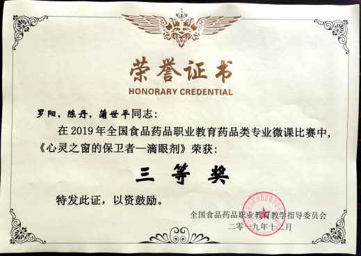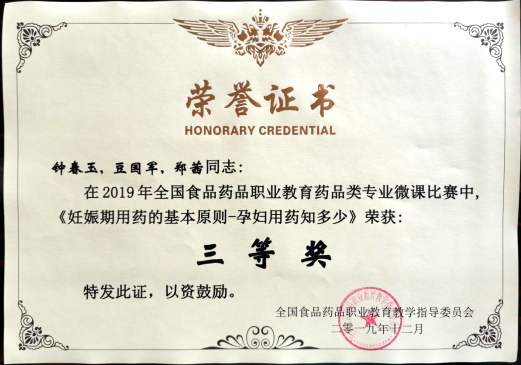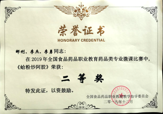 在刚刚结束的由全国食品药品职业教育教学指导委员会举办的2019年全国食品药品职业教育药品类专业微课大赛中,我院药学系选送的3个作品在全国600多个参赛作品中脱颖而出,分获大赛二三等奖。其中,邹利团队的《蛤粉炒阿胶》荣获二等奖,罗阳团队的《心灵之窗的保卫者——滴眼剂》和钟春玉团队的《妊娠期用药的基本原则——孕妇用药知多少》荣获大赛三等奖。