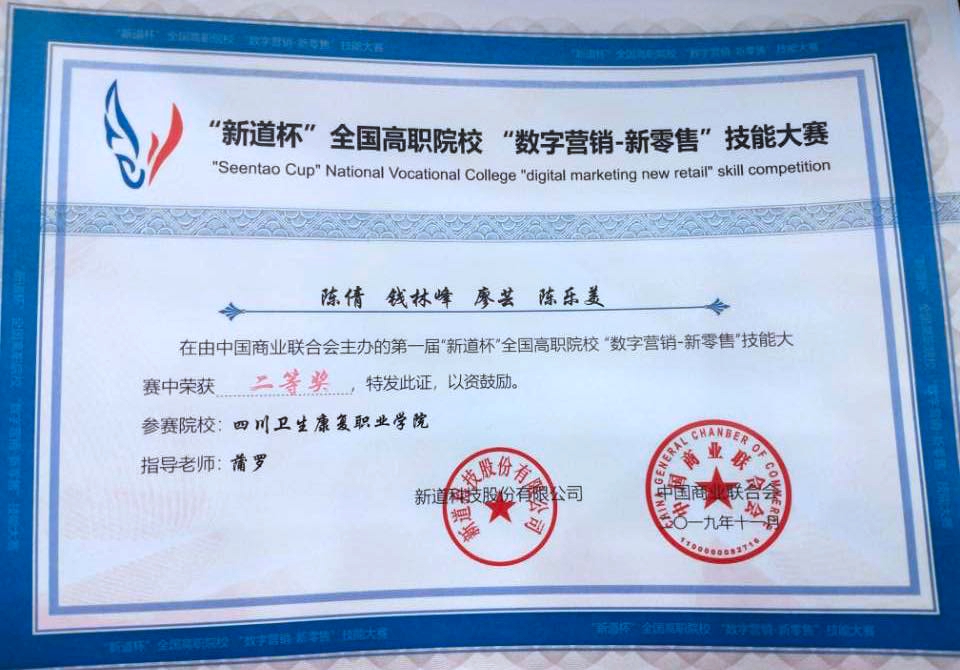 在刚刚结束的“新道杯”全国高职院校“数字营销—新零售”技能大赛中,我校药学系2018年首届招生的新专业《药品经营与管理专业》二年级学生在全国54所高职院校中表现突出,荣获全国二等奖。