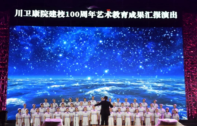 一百年的辛勤耕耘,桃李满园;跨世纪的艰苦奋斗,人才辈出。教职工与学生社团的歌曲联唱《缤纷校园》展现了学院丰富多彩的校园文化生活;附属自贡市第四人民医院充满感染力的吉他弹唱《急诊战士老曹》唱出了医者的奉献与坚守;师生情景剧《川卫康院的日子》改编自学校教师的真实事迹,让在场师生无不为之感动;附属自贡市第一人民医院的情景舞蹈《天使的摇篮》,展现了白衣天使们如圣洁的莲花般美丽而又坚强。