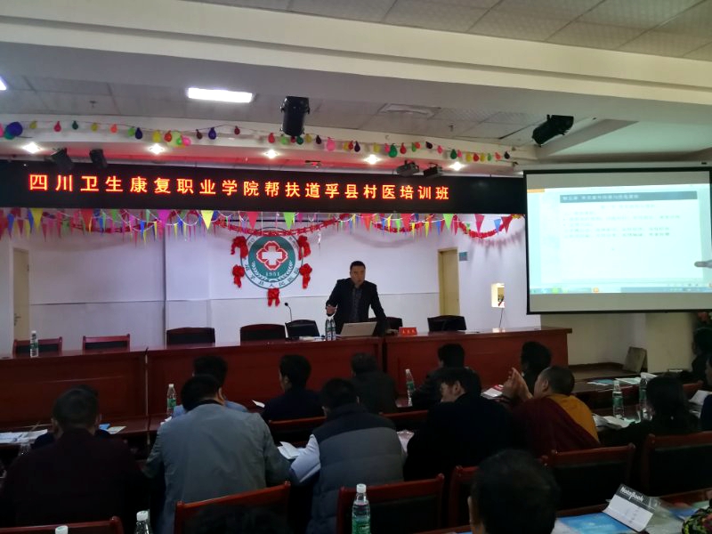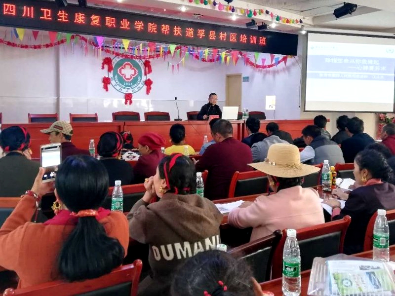 学院附属自贡市第一人民医院康复科副主任医师王关杰、健康管理科副主任医师宫吴健,附属自贡市第四人民医院门诊办公室主任张发强、急诊科副主任江从兵等根据道孚县乡村医生医学知识底子薄,临床实操能力弱的短板,认真遴选适合参培人员的授课内容,并结合自己从医多年的丰富经验,用最质朴的语言向村医们形象生动地讲授了医疗政策法规、医患沟通、常见意外伤害、中医适宜技术、急危重症、合理用药等实用技术。讲授获得了参培人员的热烈掌声。
