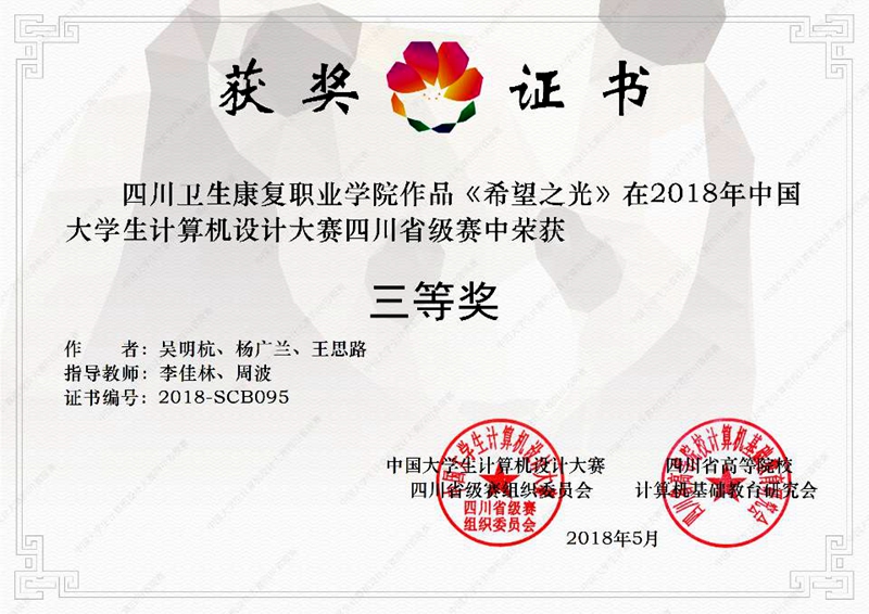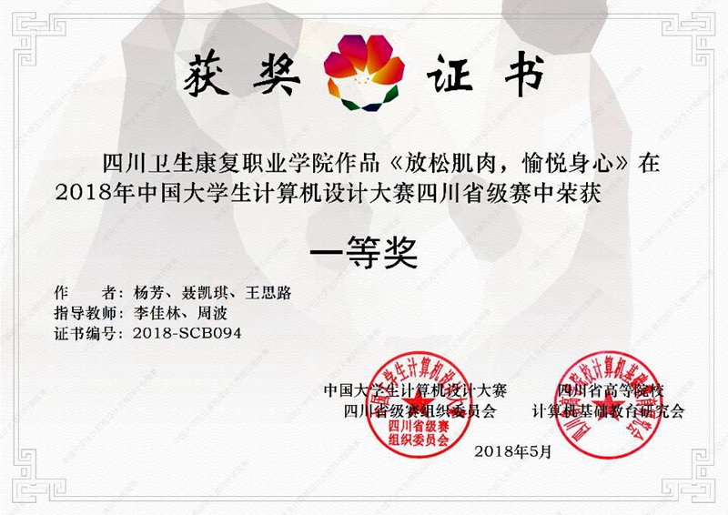 此次比赛设成都和南充两个赛区,全省10余所高校共99支队伍在南充赛区参赛。比赛包括作品展示与说明、作品答辩、作品点评等环节。经过激烈角逐,我院两支学生队伍的作品,微课《放松肌肉,愉悦身心》和图形图像设计《希望之光》分别斩获大赛一等奖、三等奖。
