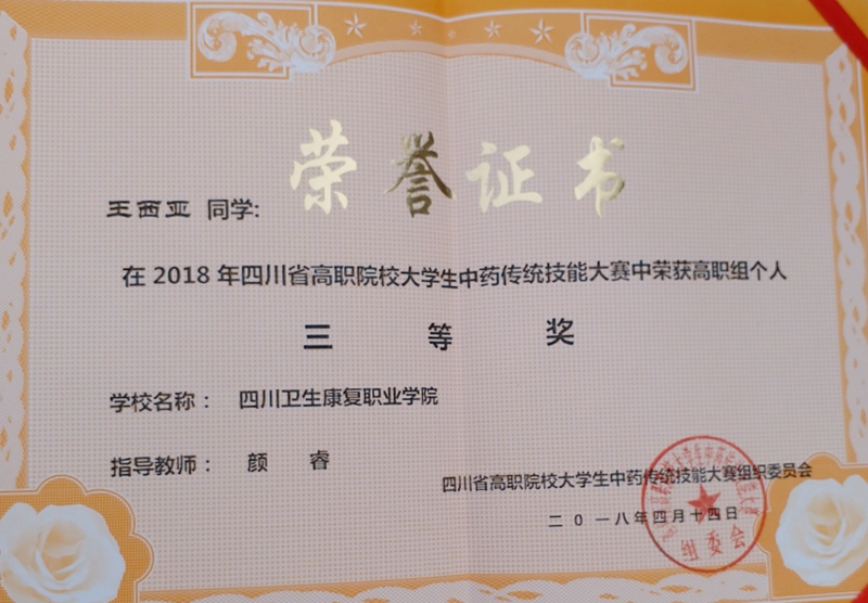 4月13至14日,在四川省中医药高等专科学校举行的四川省首届中药传统技能竞赛中,我院刚开设一年多的新专业(中药学专业)学生王西亚表现较为突出,在16名选手中以第六名的好成绩荣获大赛三等奖,并将与乐山职业技术学院和四川省中医药高等专科学校的各2名选手一道(共5人),代表四川省参加于5月31至6月1日在山东烟台举行的全国中药传统技能大赛。