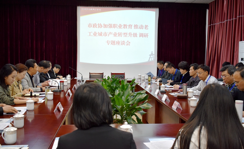 13日,市政协加强职业教育推动老工业城市产业转型升级调研专题座谈会在我院举行。市政协副主席杨廷卫出席会议并讲话。市政协调研组成员;企业代表;学院院长曾晓奇,副院长黄昌平、罗天蔚参加会议。