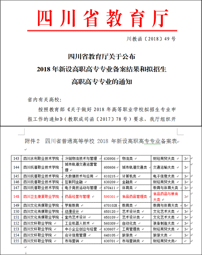 根据四川省教育厅《关于公布2018年新设高职高专专业备案结果和拟招生高职高专专业的通知》文件精神,我院申报的“药品经营与管理”专业正式被登记备案,标志着药学系又一新专业“药品经营与管理”成功申报,可以进行今年的首届招生。