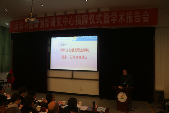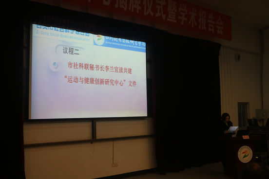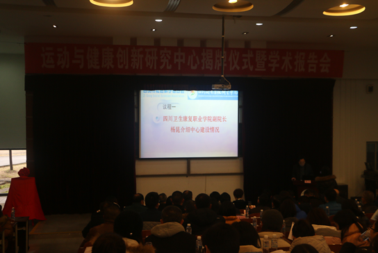 自贡市卫计委副主任章成、市教体局正县级调研员郭成钢,市社科联、市教科所相关人员,蜀光中学、自贡职业技术学校等10余所普通中学、中等职校领导及教务科长,自贡市第一、二、三、四、五人民医院等医疗机构领导及科教科长,自贡日报、自贡电视台、健康自贡等多家新闻媒体,学院有关党政领导同志、各处室系部负责人、中心负责人、部分师生代表共230余人参加了会议。揭牌仪式后,四川理工学院社会科学处处长兼学报编辑部主任陈于后教授和成都体育学院运动医学与健康学院副院长、博士生导师王煜教授,分别作了“学术论文写作的实证研究——学术期刊编者和审稿人的视角”和 “运动与健康促进——马拉松之路”的学术讲座。