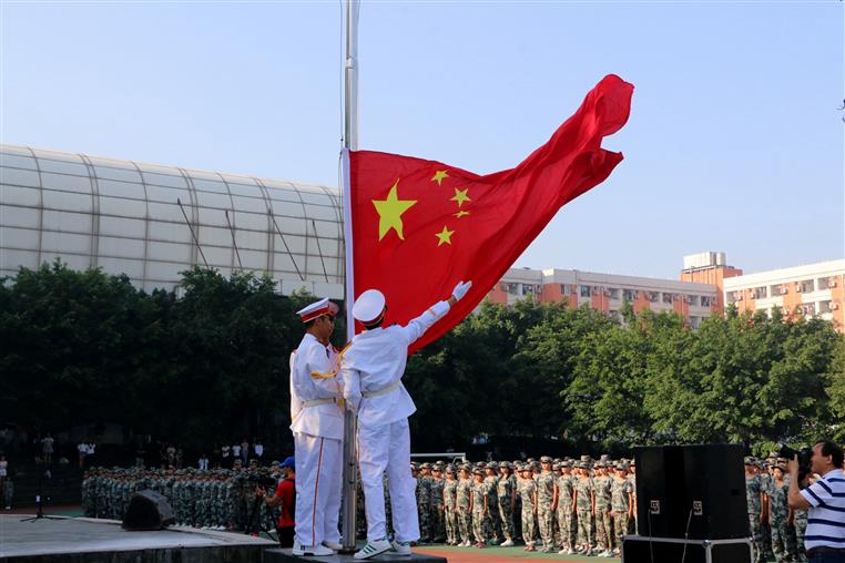典礼在雄壮嘹亮的国歌声中正式开始。2016级老生代表、2017级新生代表、教师代表分别发言。随后进行了军训汇报表演和军训表彰。
