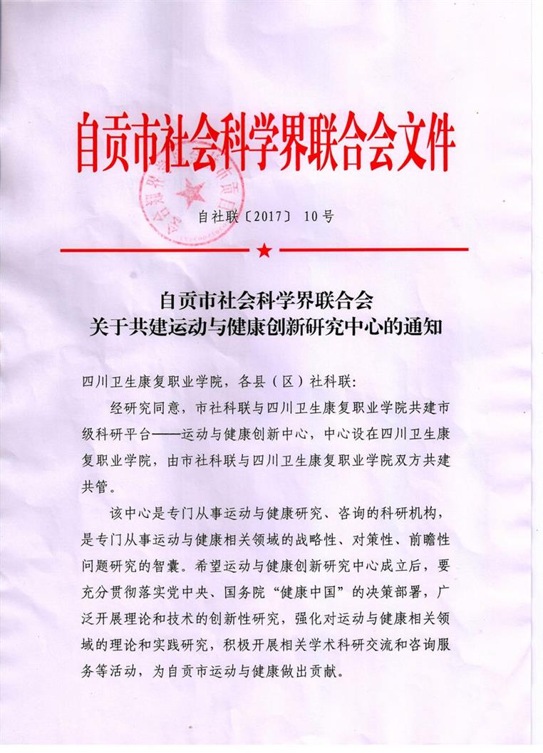 运动与健康创新研究中心由自贡市社科联与四川卫生康复职业学院双方共建共管,中心挂靠学院科研处,由人文社科部负责具体运行与管理。