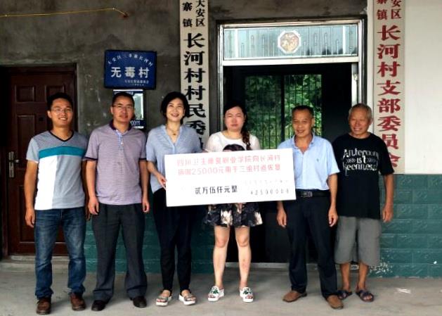 8月5日,学院党委副书记、纪委书记李华,党办主任章成来到学院对口帮扶贫困村——大安区三多寨镇长河村、联合村,对两村因7月洪灾受损情况进行再次查看,并代表学院为两村分别送上2.5万元和1万元灾后恢复重建款。