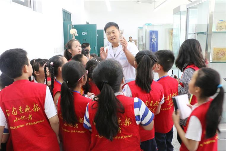 5月18日下午三点,自贡市塘坎上小学组织自贡晚报特约小记者来我院解剖陈列室参观。本次活动由基础医学部副主任李德英主持,解剖教研室主任吴波、实验教师杨勇讲解,教师陈海旭、实验教师郭常英一同参观。
