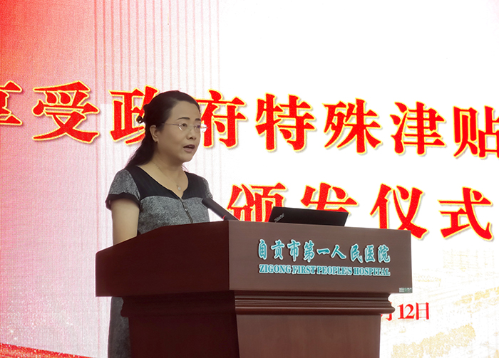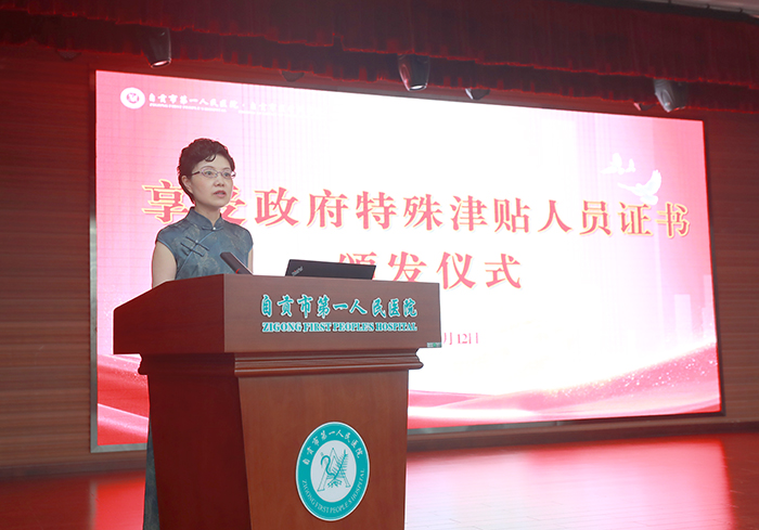 仪式上,龙承春代表市人力资源社会保障局向李爽乐表示热烈祝贺和诚挚敬意。她讲到,政府特殊津贴制度是党中央、国务院关心爱护和团结引领人才的一项重要制度,不仅是对做出卓越贡献、取得显著成就专家们的高度认可,更是深入实施人才强国战略、尊重知识、尊重人才的体现。2023年四川省获得享受政府特殊津贴专家共有91人,自贡市有2人。她希望,李爽乐要正确对待这份荣誉,充分发挥政府特殊津贴专家的骨干带头作用,继续钻研、攻克难题,发挥“传帮带”的作用,培养年轻科研技术人员,再接再厉,为推动我市卫生健康事业的繁荣发展作出新的贡献。