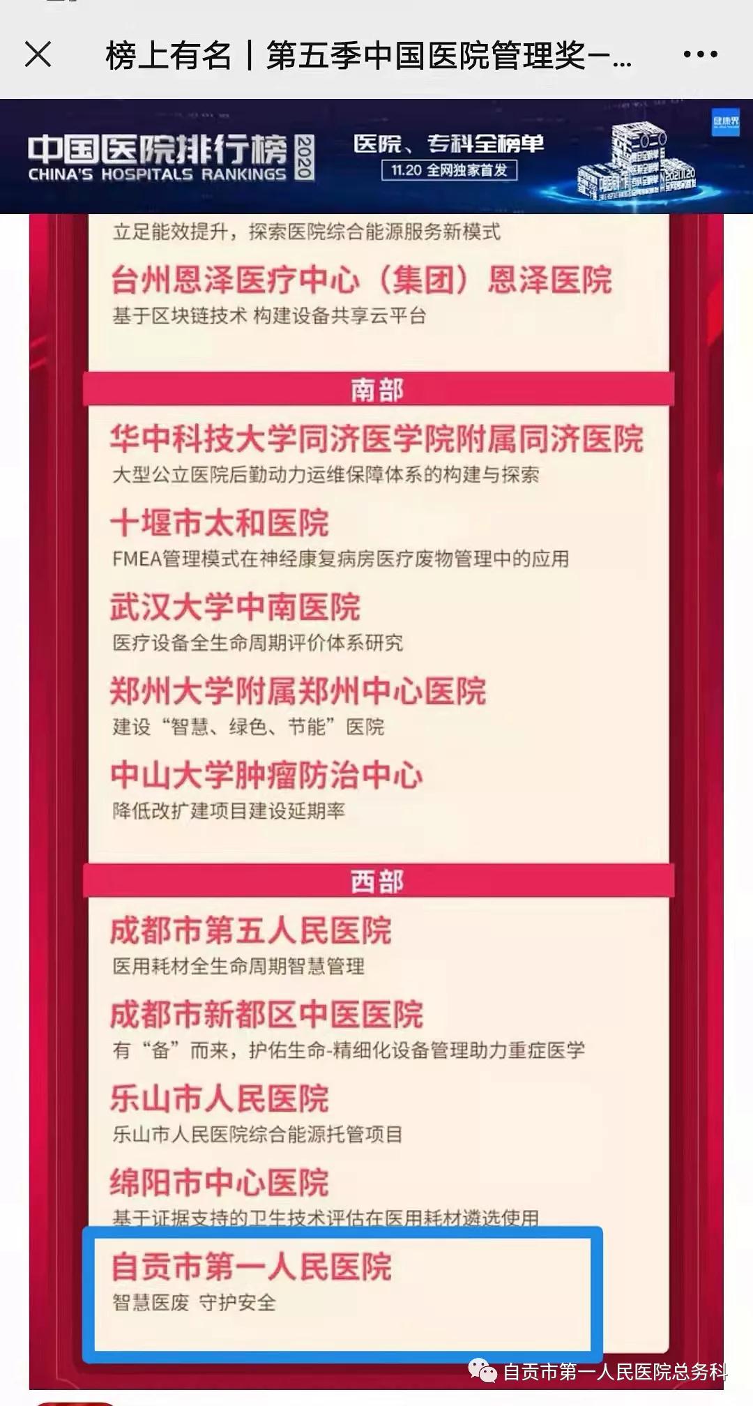 为寻找“最佳医疗实践”,在中国管理科学学会、中国管理科学学会医疗健康管理专业委员会指导下,由健康界主办、正大天晴战略支持的第五季“中国医院管理奖”评选结果出炉。我院选送的案例《智慧医废 守护安全》在“第五届中国医院管理奖”实践类案例评选中,荣获后勤管理组西部区域优秀奖,系自贡市唯一一家获奖医院。