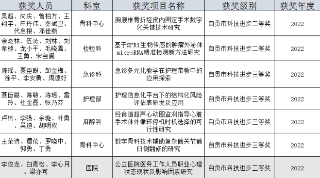 市四医院2022年度自贡市科技进步奖获奖情况