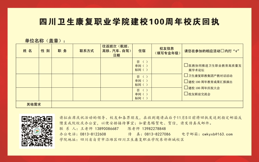 (1026定稿)四川卫生康复职业学院建校100周年校庆回执.doc