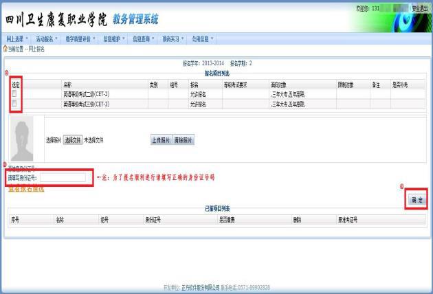 3)点击选定需报名项目进行勾选→填写身份证号码→页面右边有确定按钮点击确定