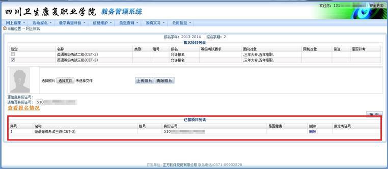 4)报名完成后在已报项目列表显示报考信息(报错可在规定的预报名时间内进行删除操作)