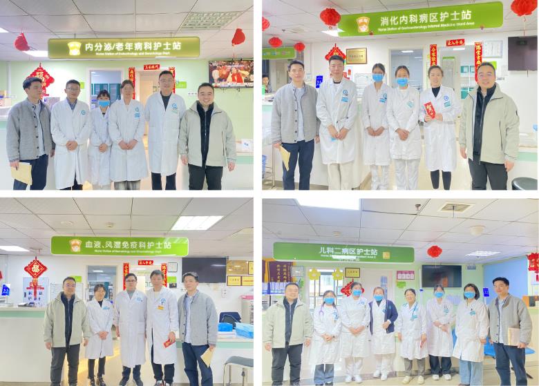 “大家辛苦了!给大家拜年了!”慰问现场暖意融融,院领导班子一行先后走进急诊科、重症医学科、手术室、各门诊、住院病房,与值班职工亲切握手、热忱交流,送上精心准备的慰问品和新春祝福。每到一处,院领导都详细询问春节期间患者收治、医疗安全、物资储备和应急保障情况,对大家 “舍小家、顾大家”的无私奉献精神致以崇高敬意和衷心感谢。