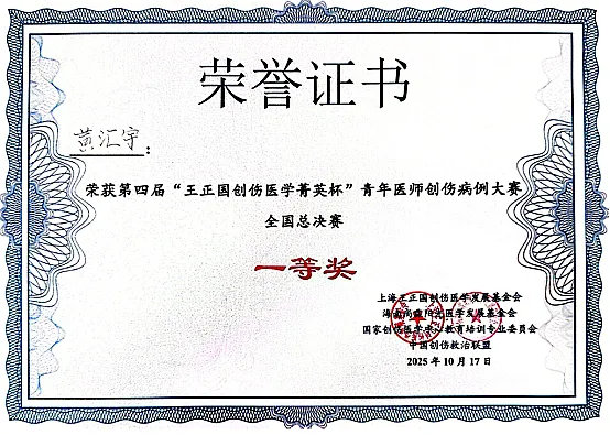 近日,第四届“王正国创伤医学菁英杯”青年医师创伤病历全国总决赛在北京大学人民医院举行。市四医院急诊科黄汇宇医师凭借出色的病例诊疗思路、严谨的临床思维和卓越的现场表现,荣获全国一等奖。