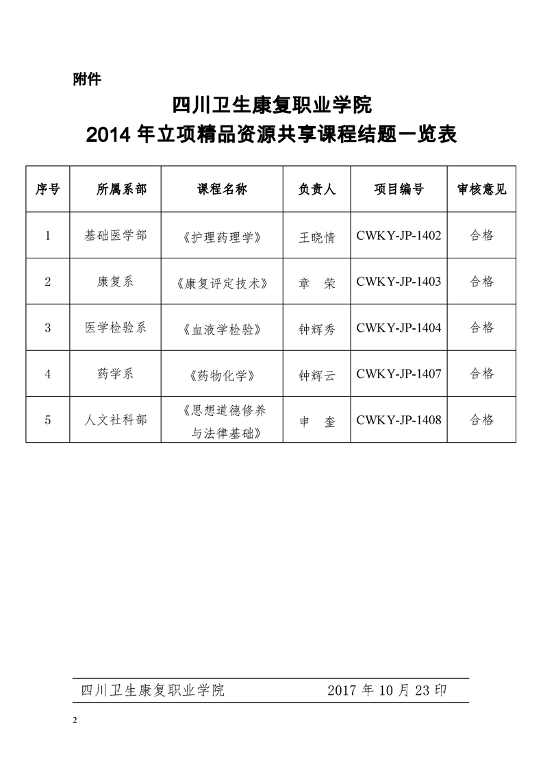 四川卫生康复职业学院关于2014年立项精品资源共享课程结题的通知
