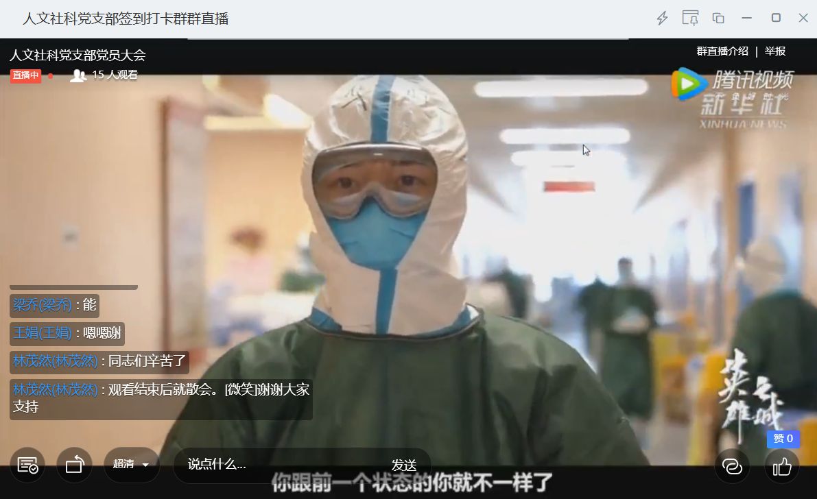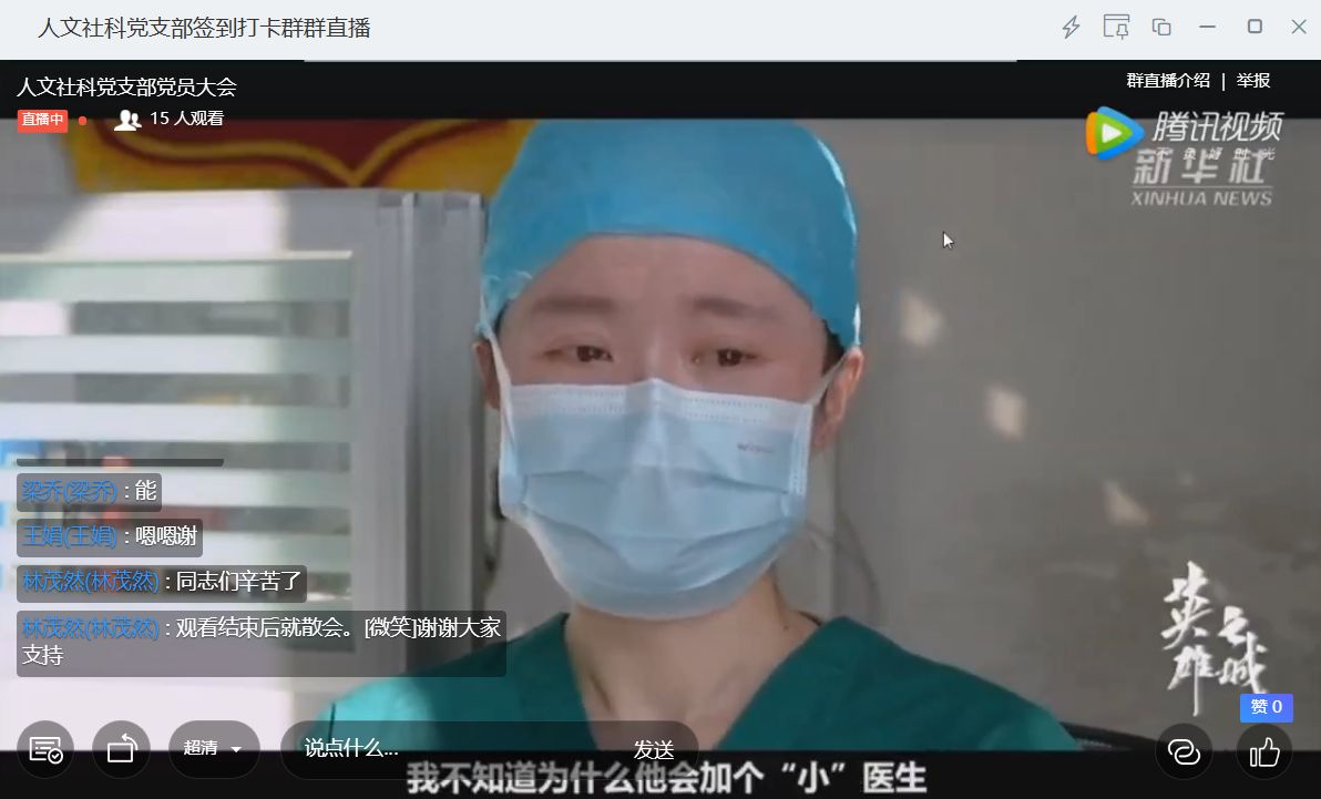 随后,党员同志们以在线观看纪录片《英雄之城》的方式,开展了党课学习。《英雄之城》是新华通讯社出品的武汉战“疫”全景纪录片。该片用镜头真实记录了武汉战“疫”2个月的重要历史时刻,首次揭秘了一些武汉战“疫”中“关键之举”背后的故事。