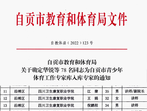 近日,自贡市教育和体育局发布关于自贡市青少年体育工作专家入库的通知,根据自教体函〔2022〕123号文件精神,教育体育学院副院长江燎、教师倪鹏程以及教师王娟成功入选自贡市“青少年体育工作专家库”。