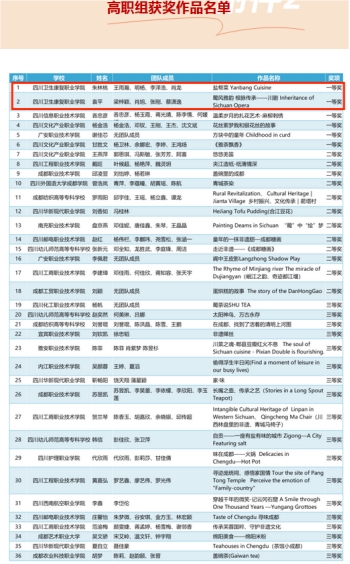 11月14日,由四川省教育厅主办的2023年四川省“高教社杯”大学生“用外语讲中国故事”优秀短视频大赛中省级获奖名单公布,由我校教育体育学院教师李捷、洪晓静、李昉带领学生录制的两部作品在全省70余件作品中脱颖而出,其中学生团队(朱林桃、王雨瀚、明杨、李泽浩、肖龙)作品《盐帮菜Yanbang Cuisine》和学生团队(袁平、梁梓颖、肖旭、张刚、蔡潇逸)作品《蜀风雅韵 根脉传承———川剧 Inheritance of Sichuan Opera》均斩获一等奖(排名前两名),同时,学校获优秀组织奖。