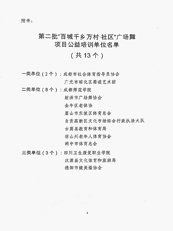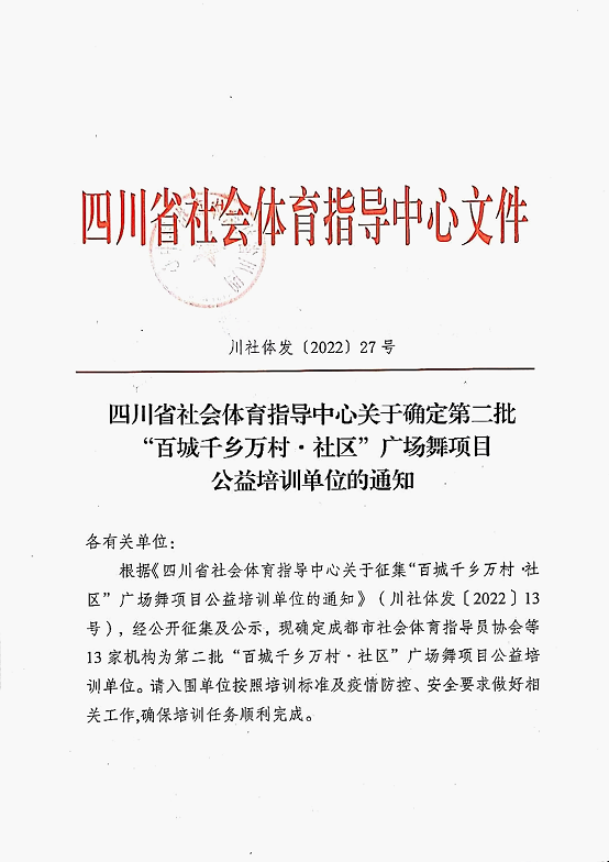 近日,四川省社会体育指导中心下发《四川省社会体育指导中心关于确定第二批“百城千乡万村·社区”广场舞项目公益培训单位的通知》,四川卫生康复职业学院被评为第二批“百城千乡万村·社区”广场舞项目公益培训单位。