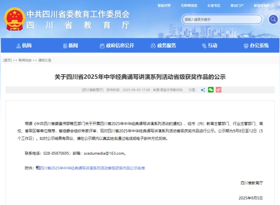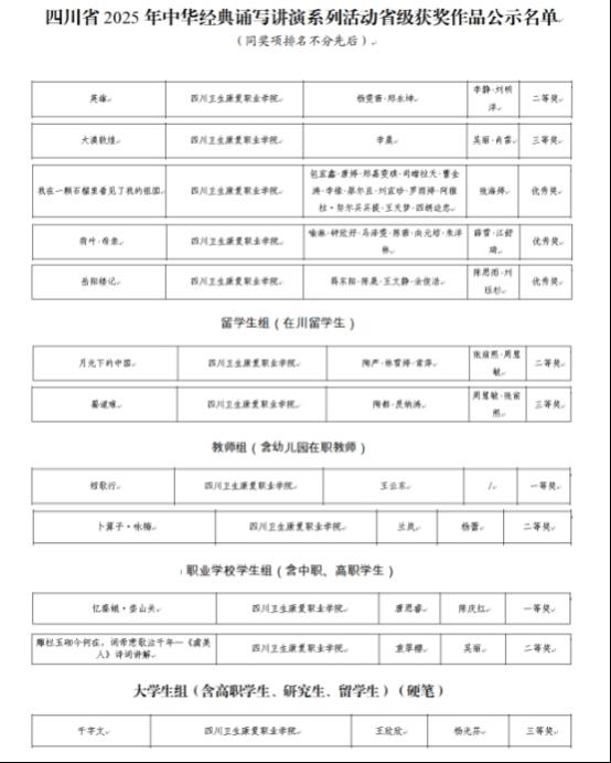 近日,2025年四川省中华经典诵写讲演系列活动(以下简称“活动”)获奖名单公布,我校师生凭借出色的创作能力,在众多参赛队伍中脱颖而出,一举荣获12项荣誉,其中教育体育学院休闲体育、健身指导与管理专业师生获二等奖1项、优秀奖1项。