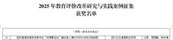 四川省教育评价改革案例评选结果公布,我校江燎、周扬静、陈余梅教师团队的《医药健康类高职体育专业“岗课赛证创”融合育人模式与评价体系实践探索》荣获三等奖。该案例在休闲体育、健身指导与管理专业实施成效显著,有效提升了学生的岗位适应能力和综合素养,为培养高素质健康体育人才探索出了可行路径。