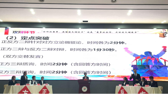 主持人宣布“明理思辨·笃学躬行”校园辩论赛正式开始。历时一个多月的激烈角逐,最终进入总决赛的队伍分别是康复系“奇正辩队”和护理系“三线rapper在线念稿队”,眼看一场精彩的辩论会就要拉开帷幕,谁会成为笑到最后的队伍呢?拭目以待吧 !