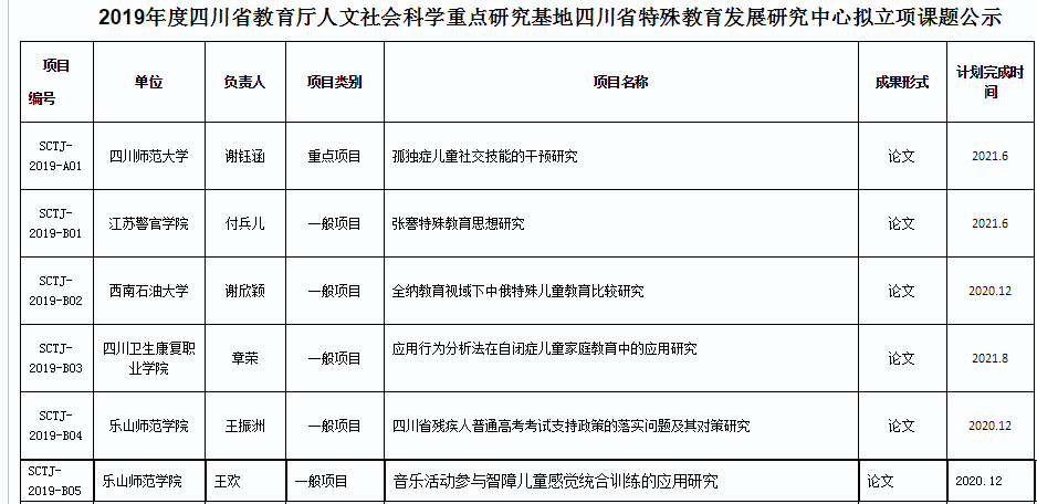 四川省特殊教育发展研究中心(以下简称“中心”)是四川省教育厅人文社会科学重点研究基地。“中心”根据四川省社科联、四川省教育厅相关管理办法,组织专家对2019年度来自省内外高校和科研院所申报的项目进行评审,最终立项课题22项,其中重点项目1项,一般项目9项,自筹项目12项。此次申报成功的《应用行为分析法在自闭症儿童家庭教育中的应用研究》将在自贡市招募一个配合意愿强、时间充裕的轻重度自闭症家庭,旨在对家长进行专业能力培训,从而达到增加自闭症家长的专业知识与技能,扩大自闭症儿童社会支持力度及重视程度的目的。