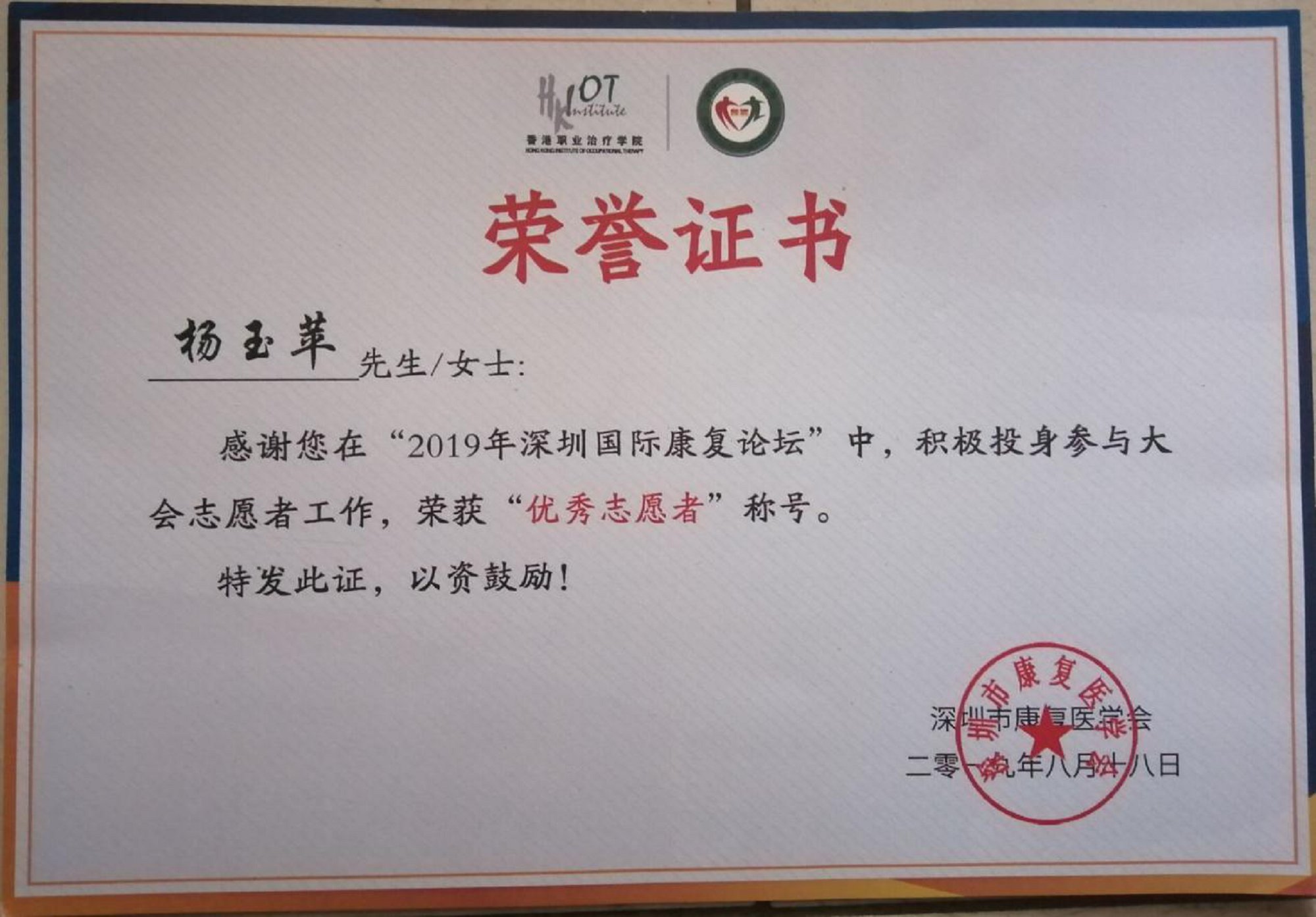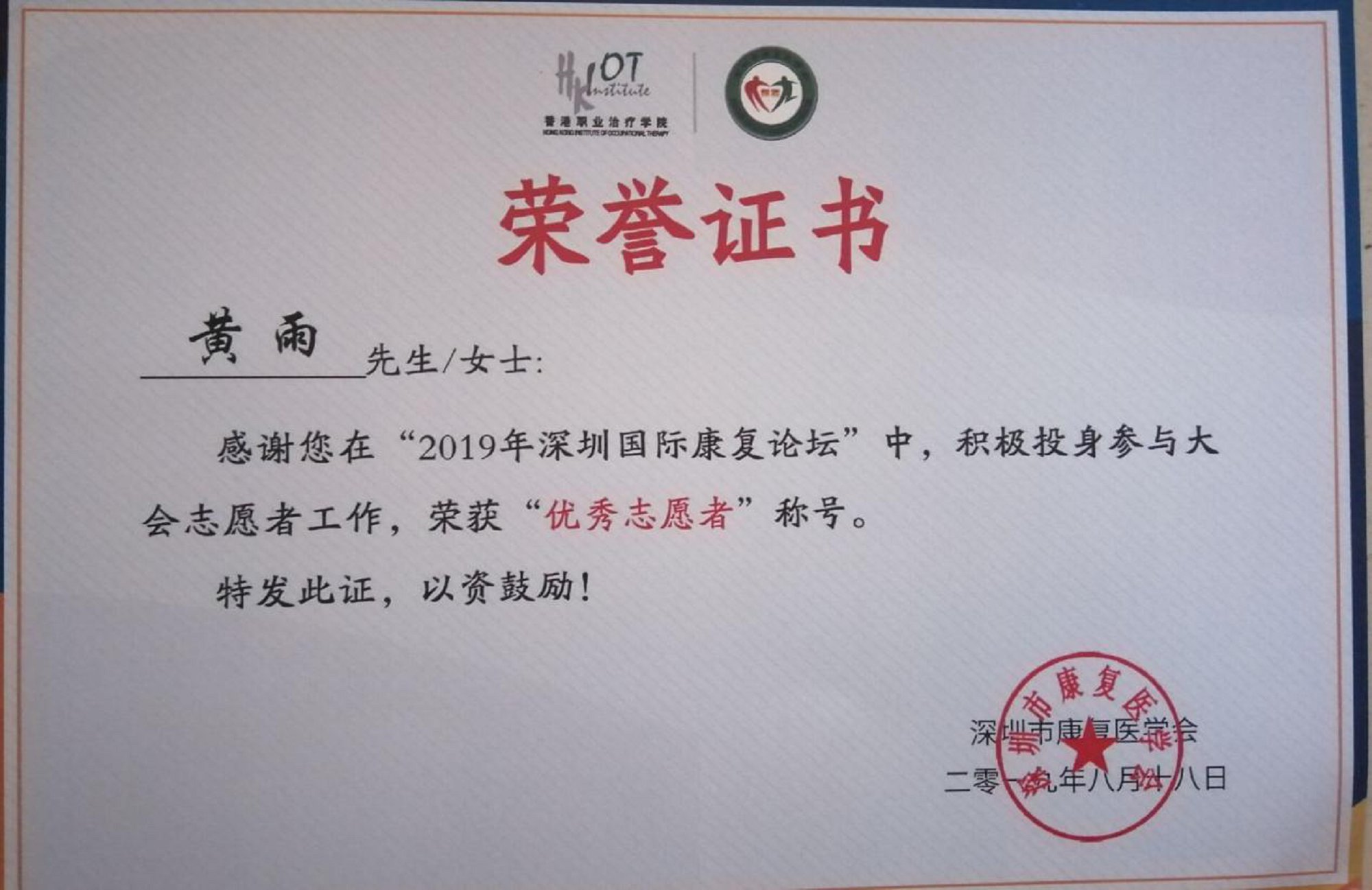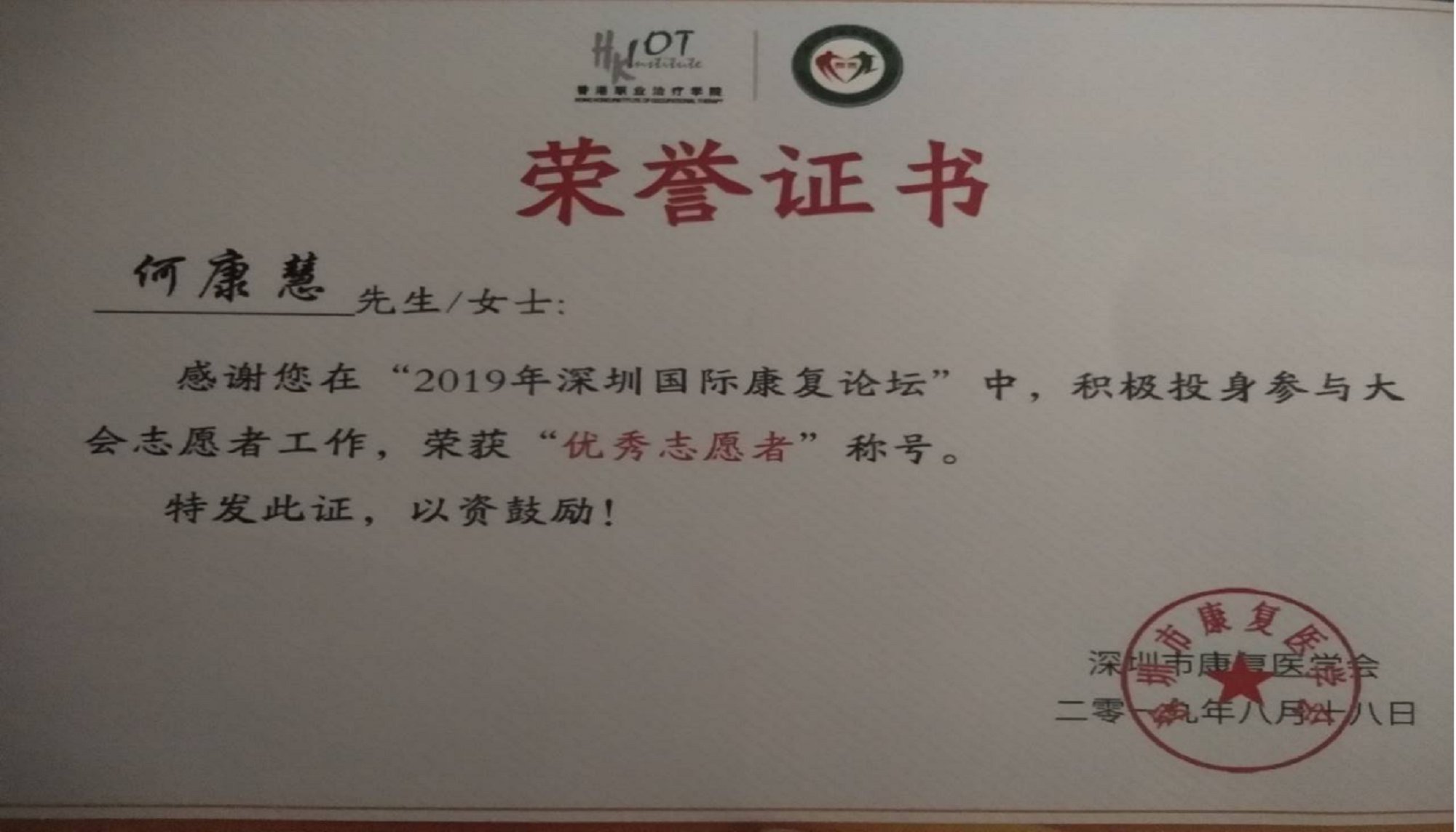 康复系在深圳二院实习的三名同学有幸在此次国际性的会议中担当了志愿者,会议期间我们的同学负责了前期的会议资料准备、会议现场签到以及后勤服务等工作。其诚恳敬业的态度和细致周到的服务,受到了大会组委会的认可和赞扬。大会组委会对学校的教育教学给予了高度认可,并为同学们颁发了“优秀志愿者”的荣誉证书。