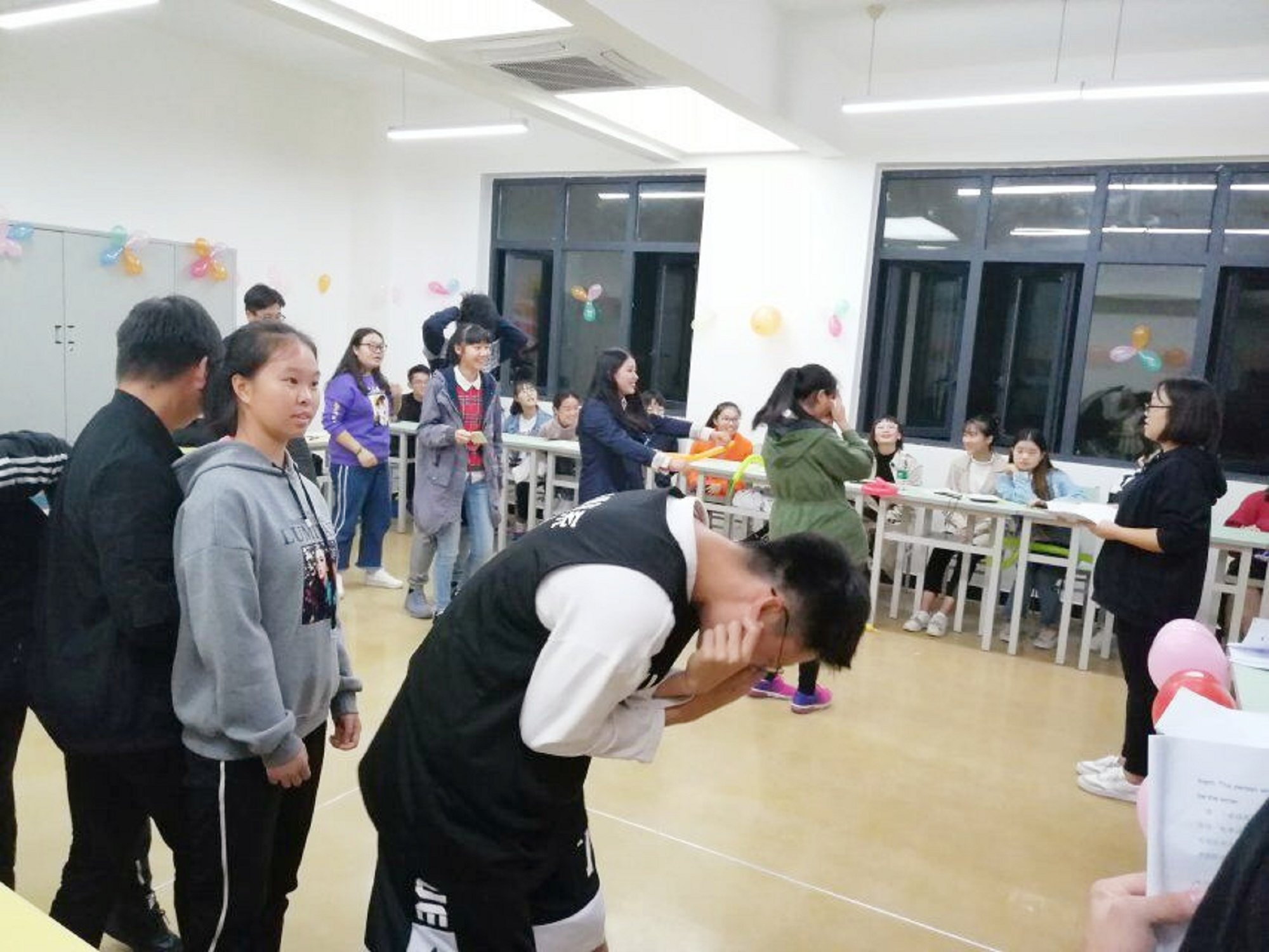 第二个活动环节是“无敌转转转”,两组同学分别站成一排,每组配备一名工作人员。每组每个同学先转五圈,再读出工作人员手中卡片单词并说出单词意思,回答正确后,换下一名同学。1分钟内回答单词数量多并正确的队伍获胜。还别说,这1分钟内说对单词数量的高手还真不少!