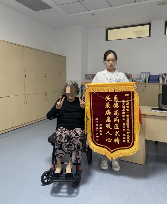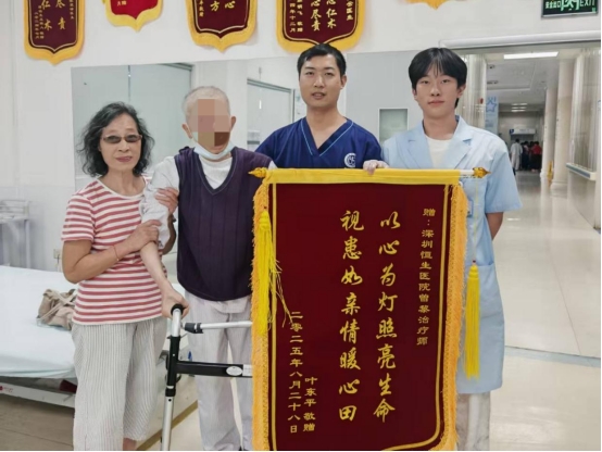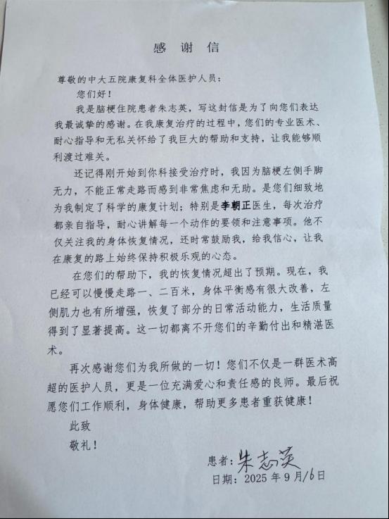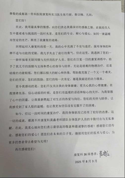 2025 年 8 月 28 日是杨荒显实习生涯难忘的一天。患者叶东平先生出院时,将感谢信交给他。叶先生因脑出血入院时卧床、右侧肢体不能动,杨荒显在带教老师指导下参与其康复训练,见证他从自主站起到搀扶行走。叶先生致谢 “谢谢你让我相信还能站起来”,这让杨荒显懂了康复需技术更需温暖,也激励他成有温度、有担当的医者。