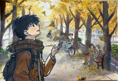 作品简介:这幅作品以秋日银查道为场景,用暖黄色调勾勒出落叶纷飞的诗意画面。男主抬眸接叶的瞬间满是对秋之绚烂的动容。背景里骑行的行人、休憩的老者,尽显秋日常态的烟火气,在“传承艺术美,秋日绘心声”的主题下,借笔端秋景,抒发对季节更迭中艺术与生活交融之美的感慨,传递出秋日独有的温柔与哲思。