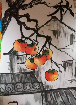 作品简介:以秋天和丰收为主题,图中柿子挂满枝头,象征着秋天的丰收与美好。右上角的“秋”字点明季节,背景的古建筑增添了古朴的气息。整幅画通过色彩与构图,传递出秋天的温暖与喜悦,寓意着丰收的季节带来的希望与满足。
