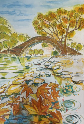 作品简介:这幅水彩画展现了秋日的静谧图景。画面中,拱桥横跨水面,金黄的树叶随风轻舞,倒映在清澈的水中,鱼儿泛起涟漪,寂静中不失灵动。飘落的枫叶与涟漪相映成趣,构成了一幅充满诗意的秋景。